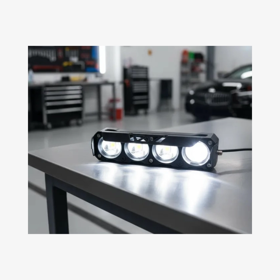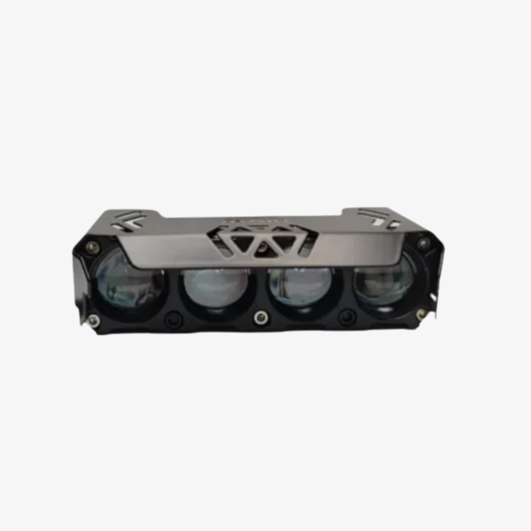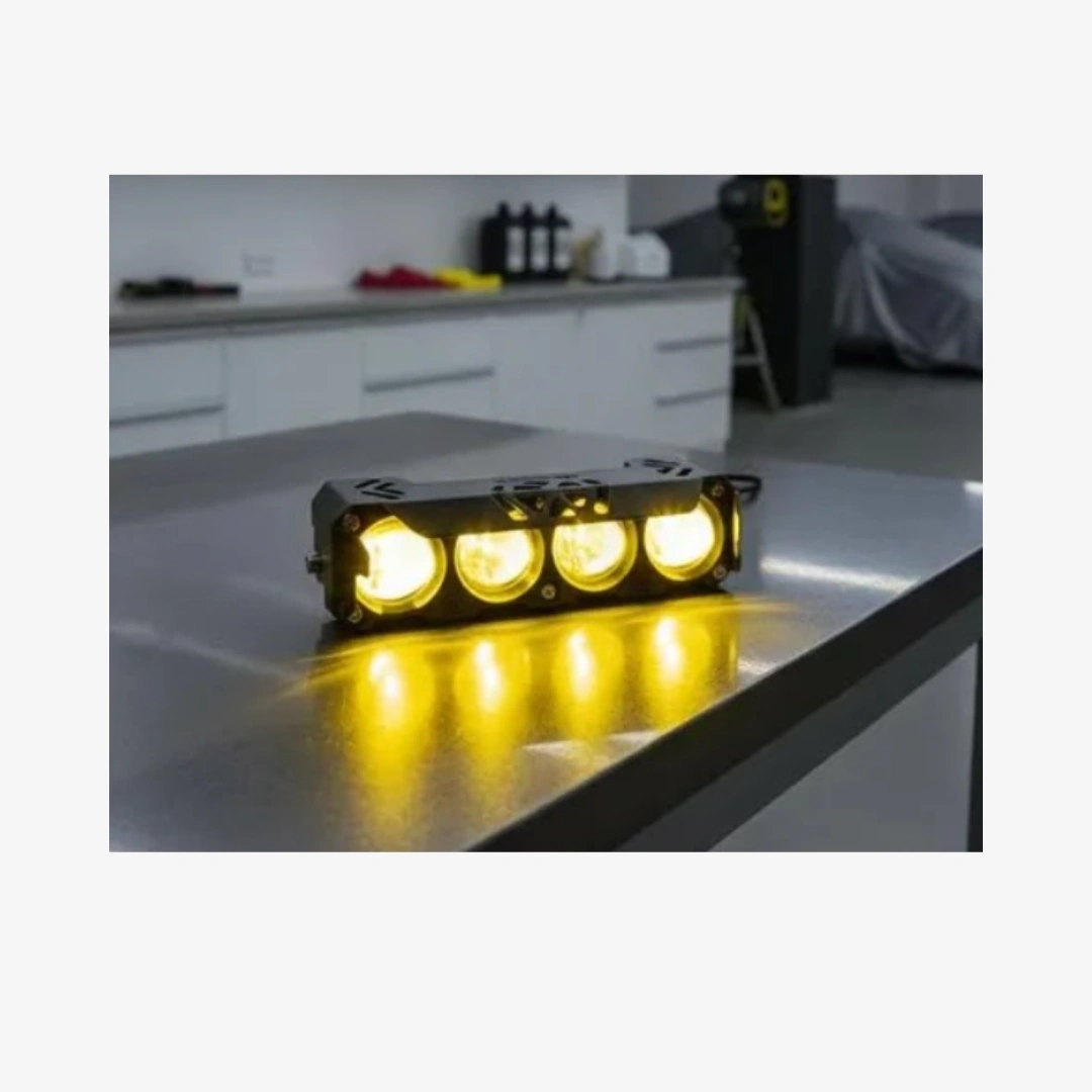 La exploradora cuenta con proyección láser blanco frío (6000K) y ámbar antiniebla (3000K), funciones fijas y estrobo en ambos colores. Cada unidad cuenta con 4 LED con proyectores/lupas (8 en total), fabricadas en aluminio y policarbonato con caperuza, medidas de 13 × 4 cm, y compatibilidad con 12V y 24V. Incluyen conector universal, soporte ajustable y kit de instalación. Protección IP68, resistentes a golpes, agua y barro. Apta para carro, moto, camioneta, bus, 4x4 y Jeep.